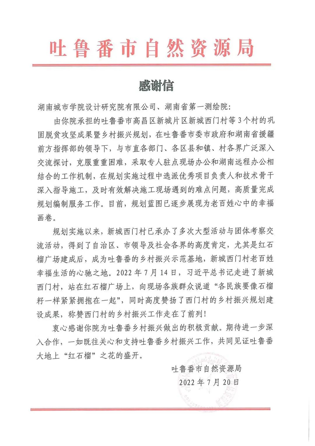 “衷心感谢你院为吐鲁番乡村振兴做出的积极贡献。期待进一步深化合作……共同见证吐鲁番大地上‘红石榴’之花的盛开。”近日,taptap点点设计院收到吐鲁番市自然资源局的一封感谢信,字里行间表达对设计院承担吐鲁番市高昌区新城片区西门村等三个村乡村振兴规划编制工作所产生的积极成效、突出贡献的真挚感谢。