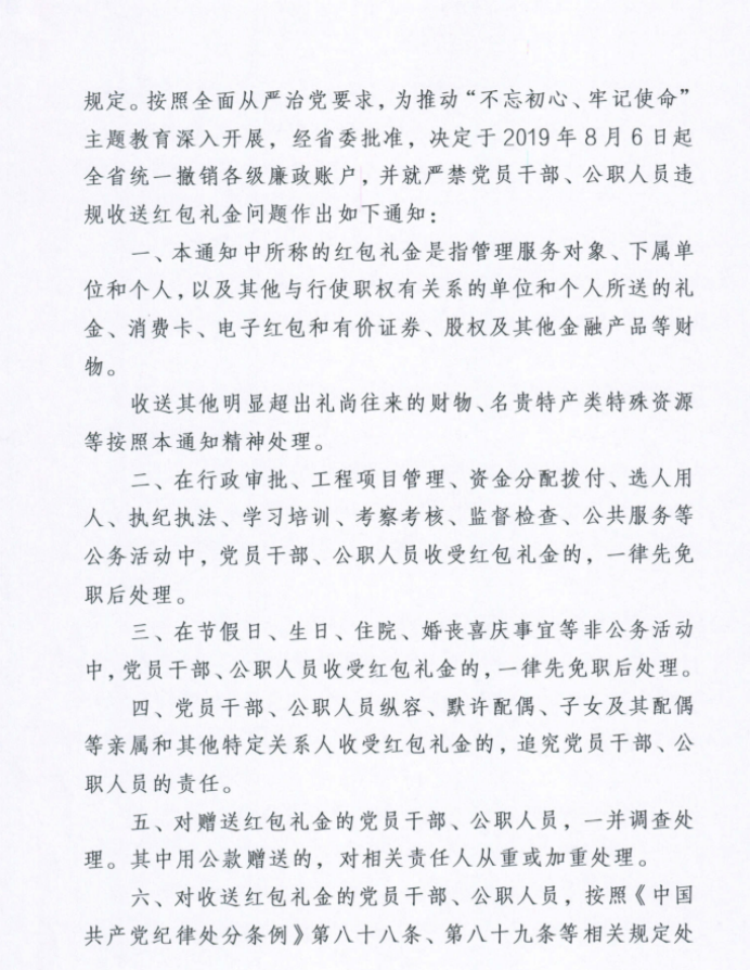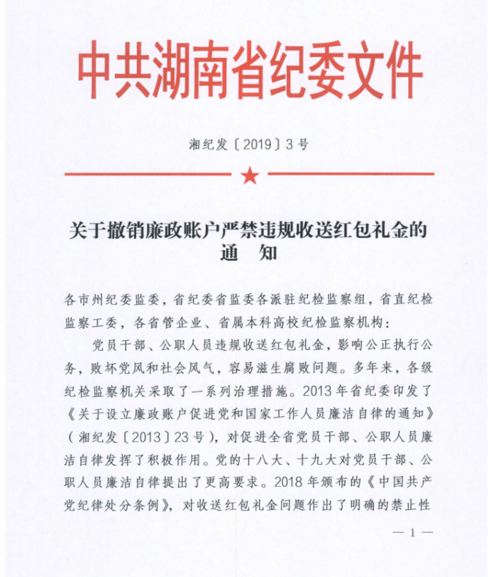 关于撤销廉政账户严禁违规收送红包礼金通知