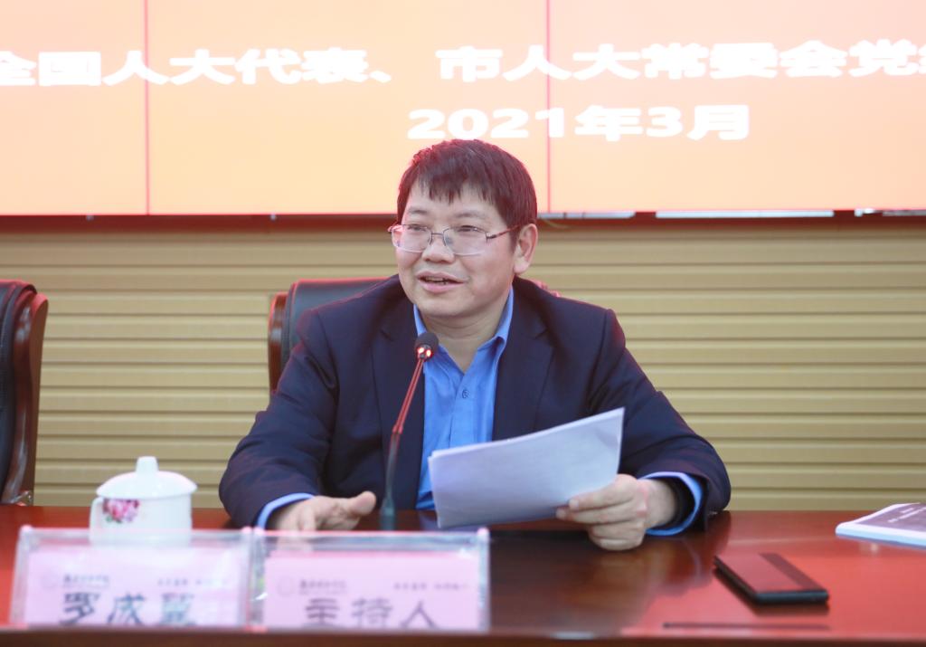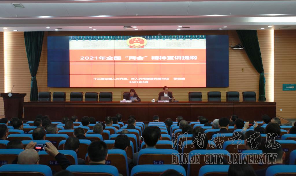 2021年3月25日下午,taptap点点在图书馆报告厅举行2021年度党委理论学习中心组(扩大)第三次集体学习。第十三届全国人大代表,益阳市人大常委会党组书记、常务副主任徐云波应邀来校作2021年全国“两会”精神宣讲。全体校领导、全体副处(含)以上干部、党支部书记、学生辅导员参加会议。宣讲会由党委书记罗成翼主持。