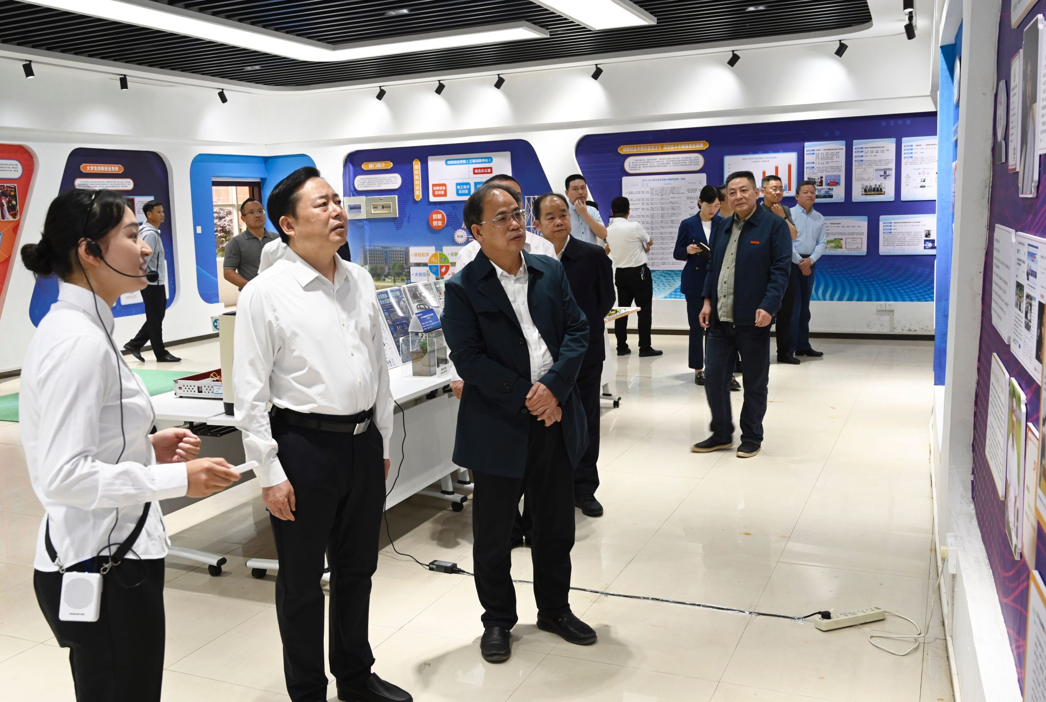 熊炜一行首先来到taptap点点大学生创客中心,参观了创新创业展厅、路演厅、团队工作室和项目咨询室,察看师生创新创业成果展示,充分肯定了taptap点点学子在科技创新方面展现出的专业素养和创造才能。