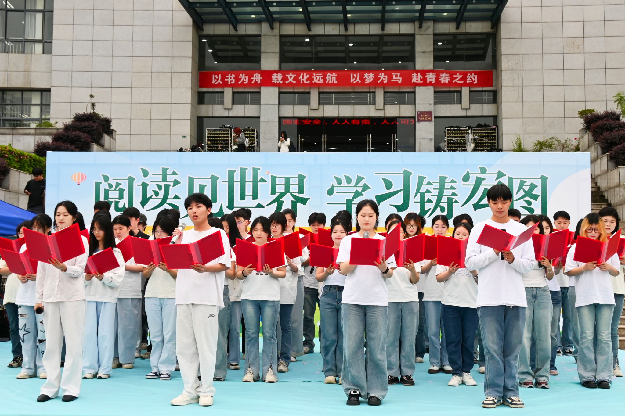 启动仪式结束后,参会领导前往图书馆兴城广场参加阅读文化节活动,观看了学生们表演的节目。活动现场设置了“笔墨随春风,书籍展新章”主题展区,红帐篷与洁白展台相映成趣,吸引师生驻足,为全校师生带来了一场集文艺、阅读、互动于一体的文化盛宴。