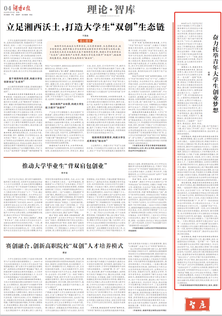 本网讯 6月9日,校长何振在《湖南日报》理论·智库版发表题为“奋力托举青年大学生创业梦想”的理论文章。文章指出,湖南高校应抢抓大好机遇、用足利好政策,奋力点燃并托举青年学子创业梦。
