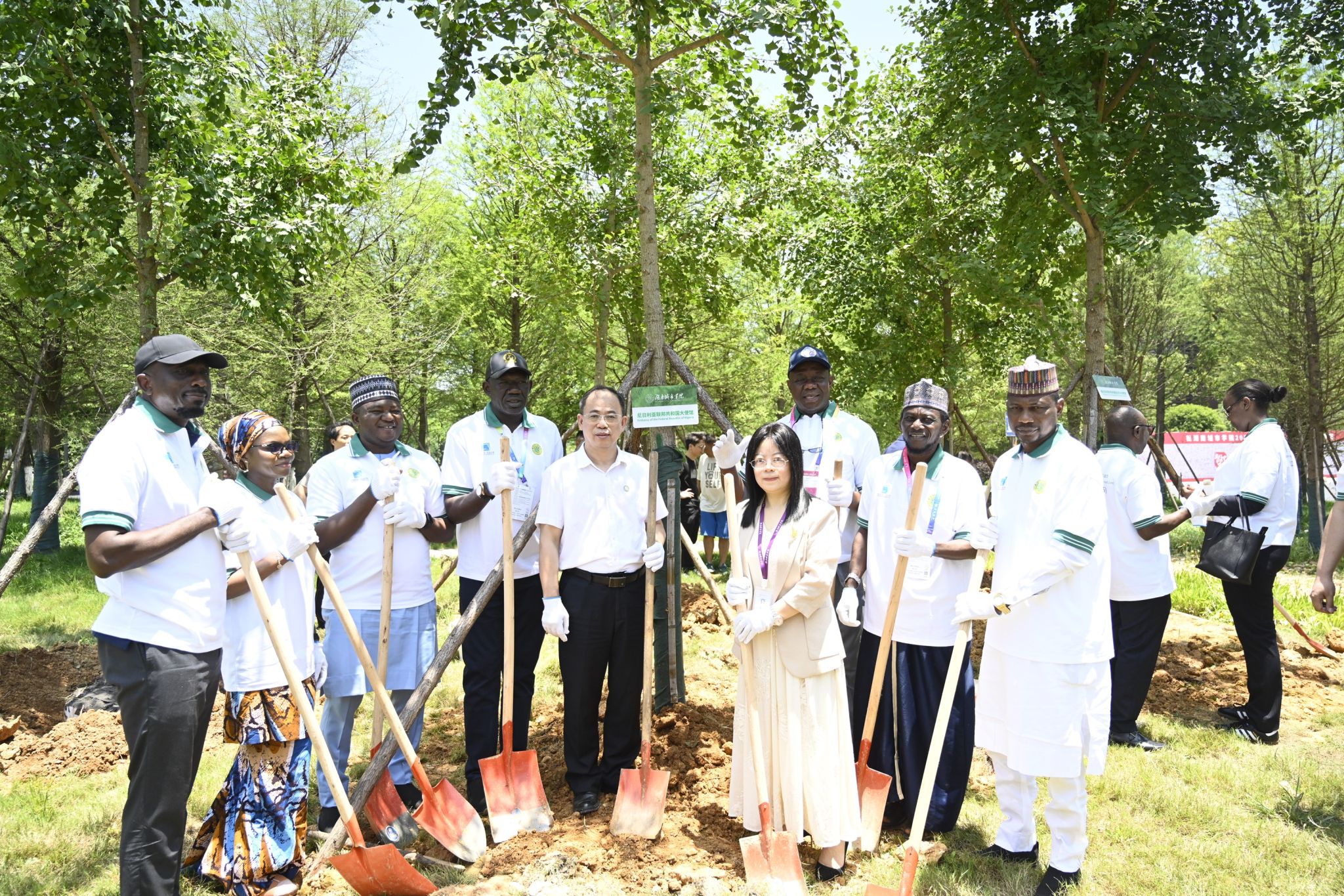 “共植友谊之树、文明之树、未来之树!”在中非文化园,何振、徐姝与来宾共植友谊树,寓意中非情缘代代传承,中非友谊根深叶茂。