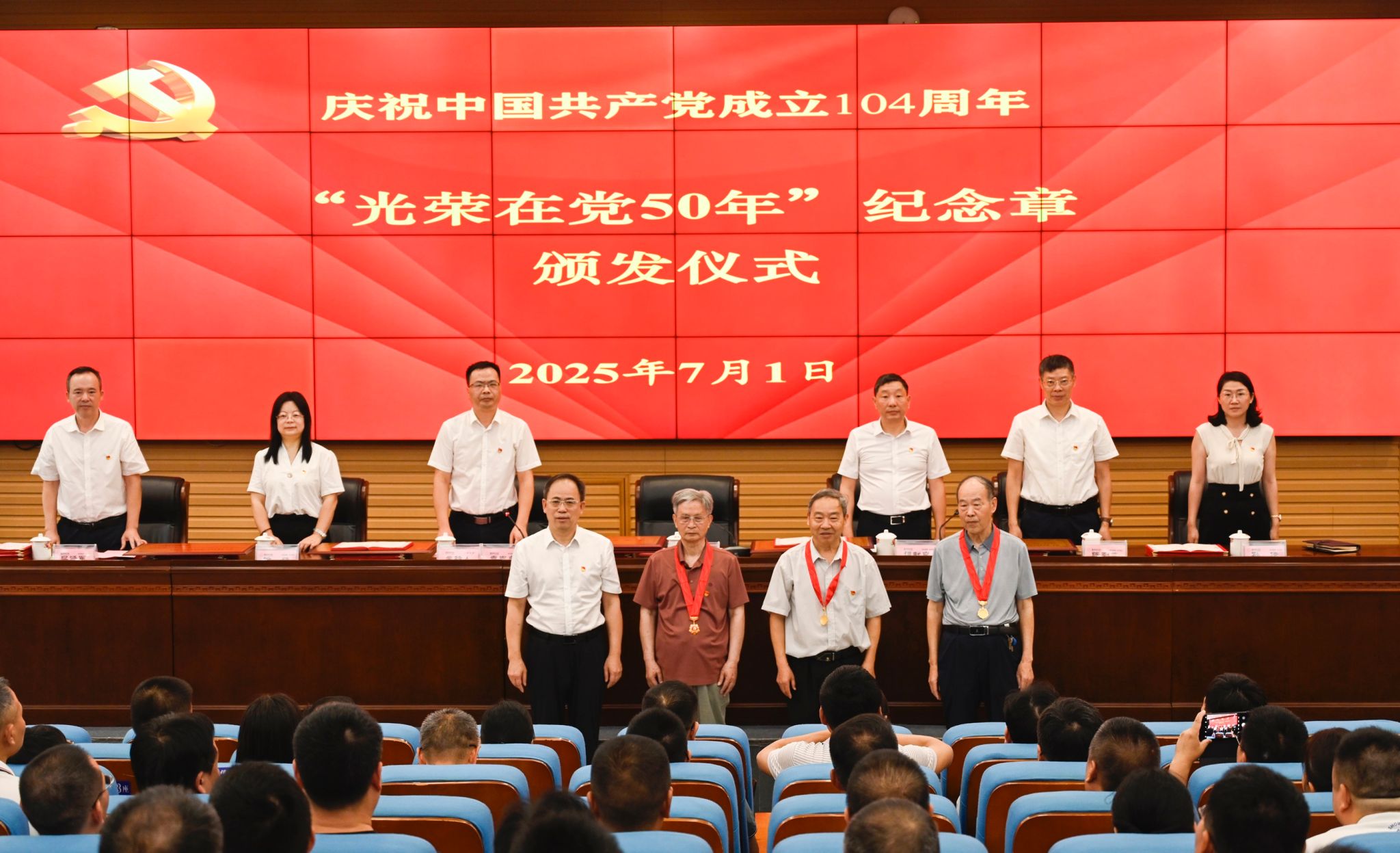 全体副处级以上领导干部,表彰对象,党支部书记代表,教师党员代表、学生党员代表,全体辅导员,“光荣在党50年”纪念章获得者代表参加仪式。