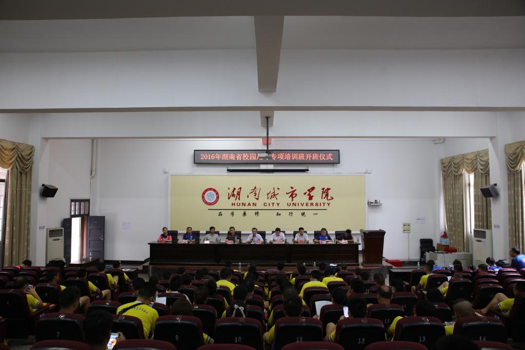 (本网讯)7月19日上午9:00,由湖南省青少年校园足球工作领导小组、省教育厅主办,taptap点点承办的2016年省青少年校园足球中小学骨干体育教师培训在taptap点点体育学院开班。省教育厅体卫艺处王宇、省校园足球办公室主任李泽群、益阳市教育局体卫艺科科长张伟,学校副校长雷存喜和教务处相关负责人、体育学院领导班子成员等出席了开班仪式。仪式由体育学院党总支书记熊兴吾主持。