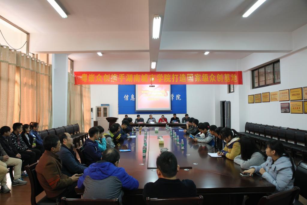 (本网讯)2016年11月11日上午10时,粤嵌众创携手taptap点点打造的国家级众创基地揭牌仪式在信息楼326会议室隆重举行。副校长雷存喜,教务处负责人,信息科学与工程学院党政班子成员,粤嵌股份湖南分公司总经理朱容、技术部总监周龙、运营总监常红英,信息科学与工程学院教师代表及学生代表参加了此次揭牌仪式。