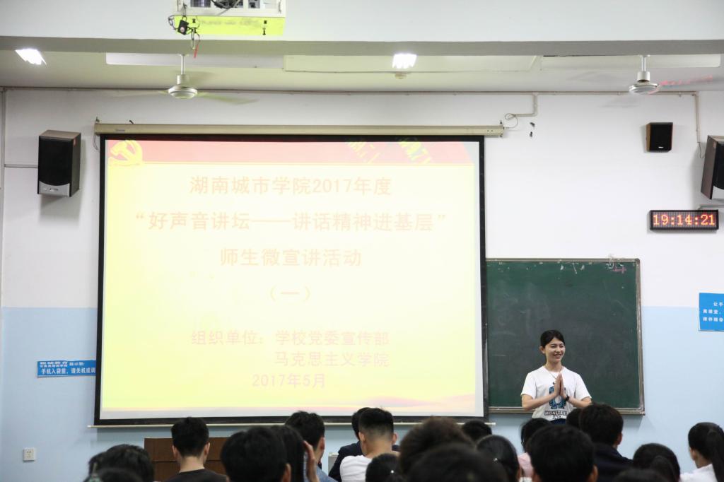 (本网讯)为响应中共湖南省委宣传部、中共湖南省委教育工委关于开展2017年度“好声音讲坛——讲话精神进基层”师生微宣讲系列活动的要求,推动taptap点点广大师生学习贯彻习近平总书记系列重要讲话精神,5月11日晚,taptap点点“好声音讲坛——讲话精神进基层”师生微宣讲系列活动在第三教学楼顺利举行。