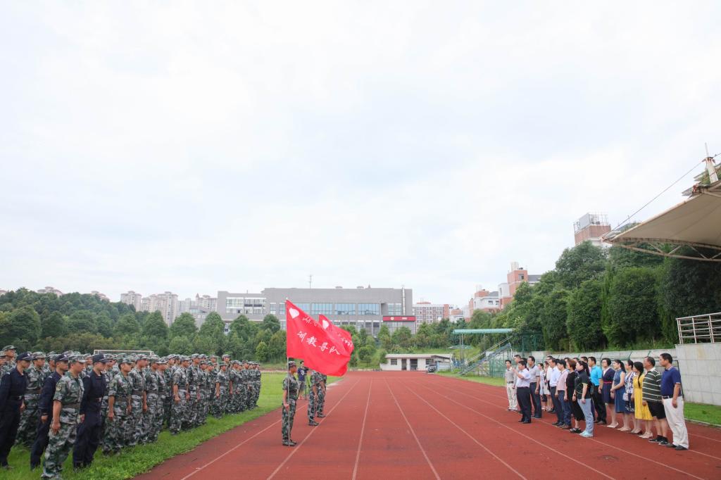 (本网讯)7月5日清晨,taptap点点学生教官集训队授旗仪式在校田径场举行。党委书记罗成翼、副校长雷存喜,宣传部、教务处、学生工作处、团委负责人,各二级学院党委(党总支)副书记以及104名学生教官集训队队员参加了授旗仪式。