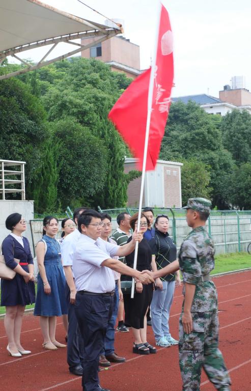 仪式上,罗成翼和雷存喜代表学校分别向军训教导队、民兵预备役分队和学生纠察队进行了授旗。