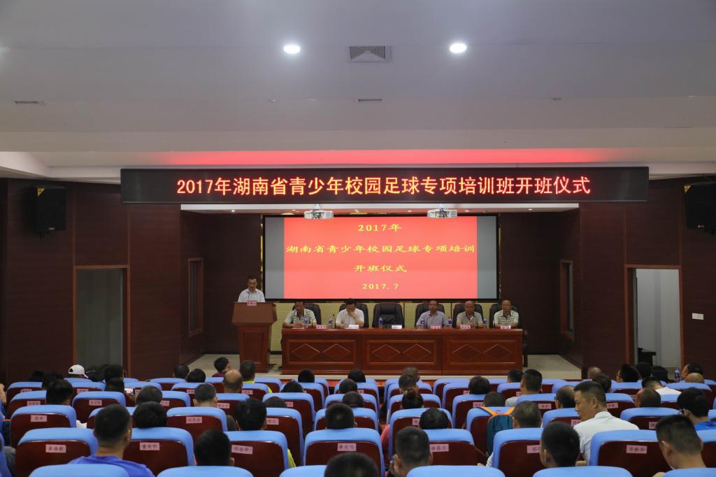 (本网讯)7月27日上午9:00,由湖南省青少年校园足球工作领导小组、省教育厅主办,taptap点点承办的2017年省青少年校园足球中小学骨干体育教师培训在taptap点点开班。副校长雷存喜、省青少年校园足球工作领导小组办公室专员王冬冬、益阳市教育局体卫艺科科长张伟、体育学院领导班子成员、本期培训班教师团队、班主任及工作人员等出席了开班仪式。