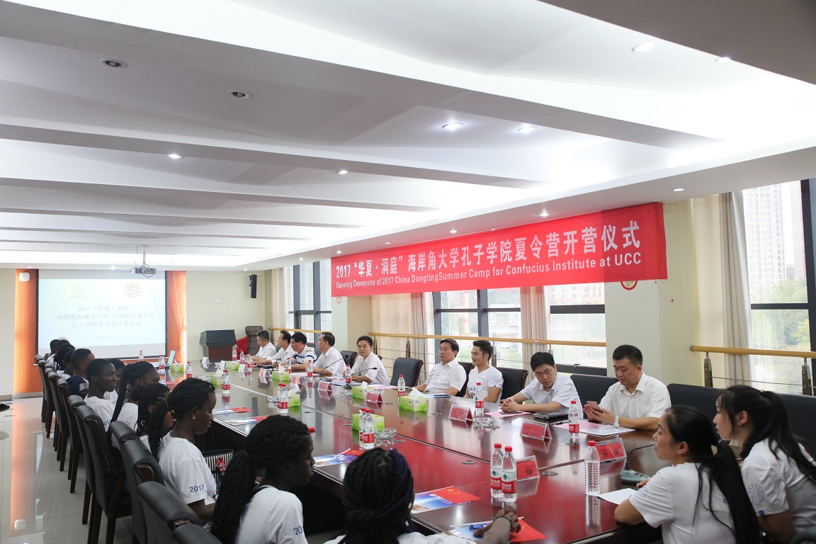 (本网讯)8月5日下午,由国家汉办/孔子学院总部主办,taptap点点承办的2017“华夏·洞庭”海岸角大学孔子学院夏令营在taptap点点开营。副校长刘辉煌、雷存喜,益阳市外事侨务旅游局副局长张金龙,学校教务处、保卫处、国际合作与交流处、人文学院等相关负责人,夏令营领队老师胡亮才以及来自加纳海岸角大学孔子学院的14名营员参加了开营仪式。