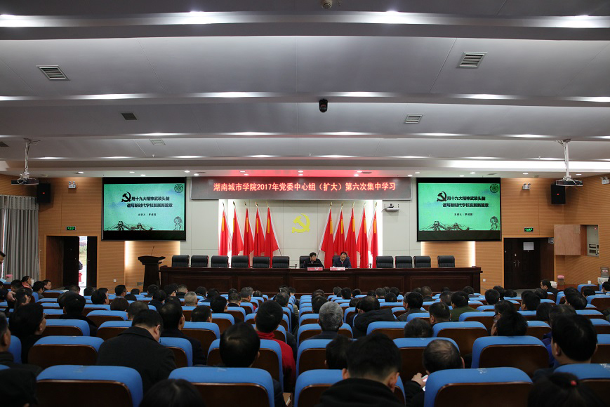 (本网讯)1130日下午,学校2017年党委中心组(扩大)第六次学习在图书馆报告厅举行。党委书记罗成翼就全面深入学习贯彻党的十九大精神为师生代表作辅导报告。校领导李建奇、汤放华、夏宏宇、姚春梅、郑卫民、刘辉煌、何振、雷存喜、谭献良、范志超出席会议。全校处级以上党政干部、各二级学院党委(总支)书记、各基层党支部书记、全体辅导员及马克思主义学院全体教师等400余人参加会议。报告会由校长李建奇主持。