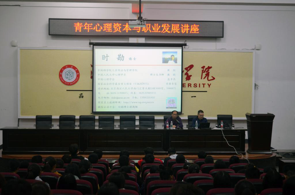 (本网讯)2018年9月27日晚,中国科学院博士生导师时勘教授应学校之邀,在电信楼视频会议室以“心理资本与职业生涯”为题,为师生展示了一堂富含学术性和应用性的启发式观摩课程。讲座由副校长何振主持。