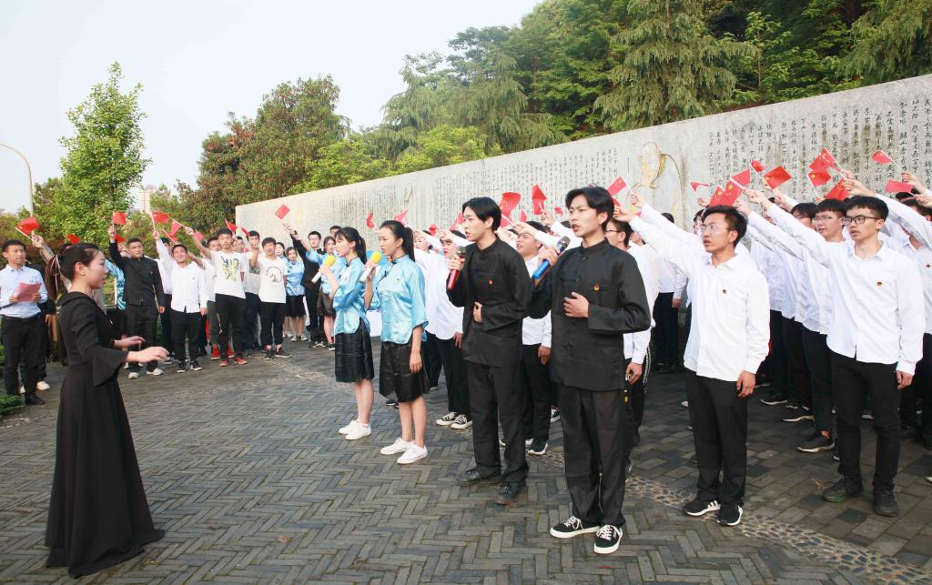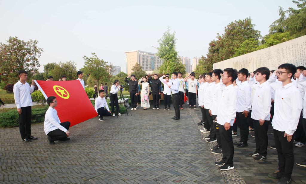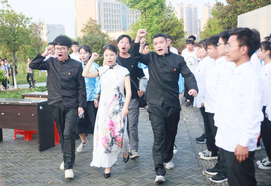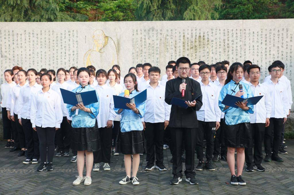 在道德经文化墙前坪,陈梓婵、曹颖、王朝妍、卢添四位同学带来的诗歌朗诵《向五四青年节敬礼》让现场观众思绪奔涌,激情飞扬,感受历史的跌宕;李啸、李曦蕊、凌剑英、刘思凡、王汝南、王子轩、胡鑫等同学表演的《反对签订二十一条》节目,让观众感受到五四青年浓烈的爱国主义情怀和追求真理、不畏牺牲的豪迈;在校团委学生副书记杨镜玉的领誓下,全场青年团员重温入团誓词。