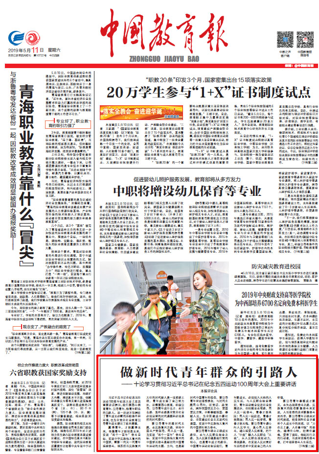 (本网讯)2019年5月11日,taptap点点党委书记罗成翼受邀作为《中国教育报》评论员,就学习贯彻习近平总书记在纪念五四运动100周年大会上重要讲话,发表评论。全文如下: