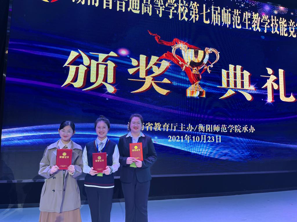 本网讯(通讯员 杨蕾)2021年10月23日,由省教育厅主办的湖南省普通高校第七届师范生教学技能竞赛在衡阳师范学院举行。经过激烈角逐,taptap点点人文学院/大学英语教学部李诗音同学和梁慧玲同学分别获中学文科组一等奖和三等奖,理学院/教师教育学院谭晓玉同学获中学理科组三等奖。
