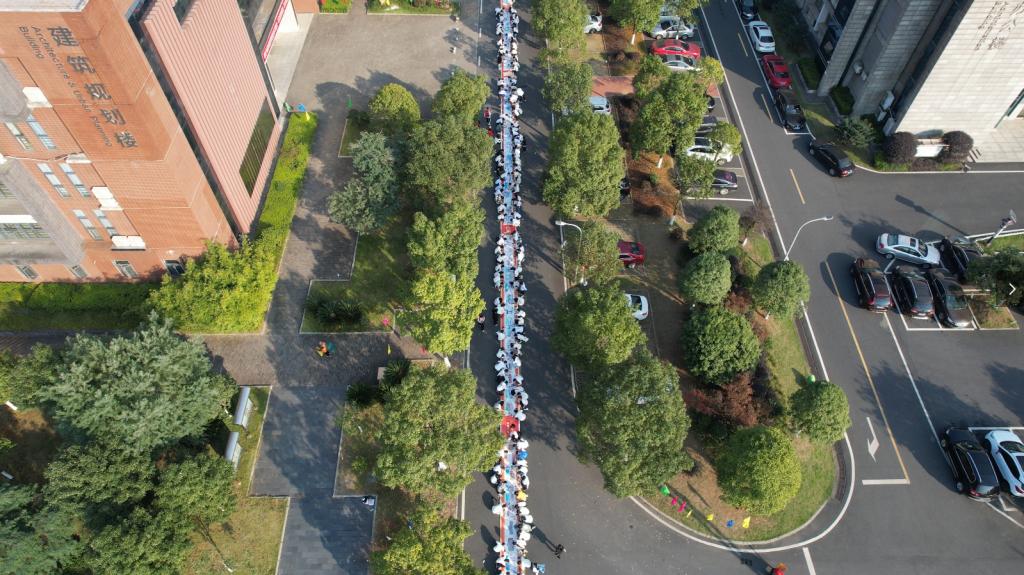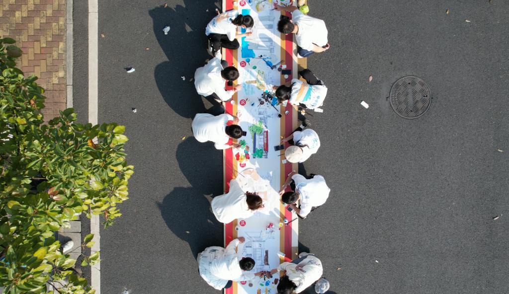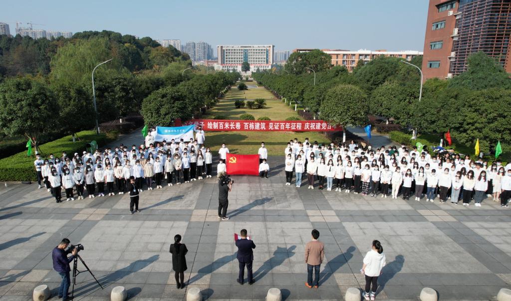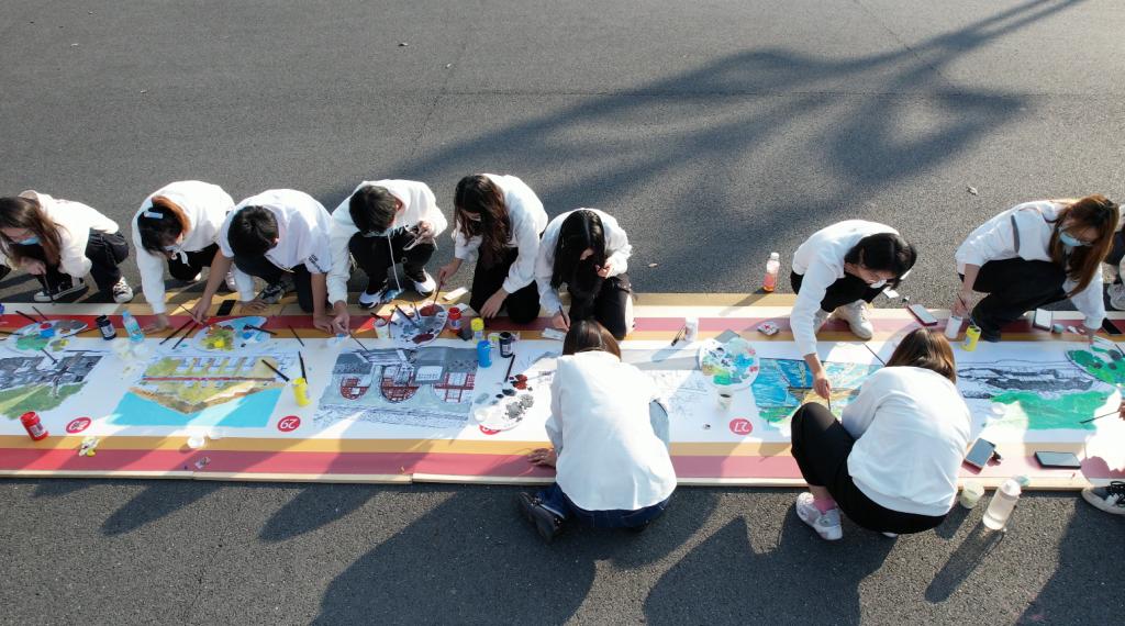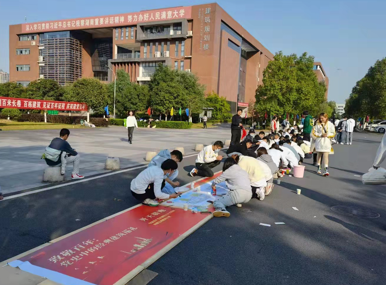 活动现场,百米长的画板依次排好,百名青年学子同时开工,大家以画传情、以画抒志,把对党的热爱和对祖国的深情浓缩在绚烂的画纸之上。画卷以建筑为载体,以画笔为镜头,围绕“开天辟地”“改天换地”“翻天覆地”“惊天动地”“今日城院”五个主题,百座中国红色地标建筑和城院经典建筑跃然纸上。