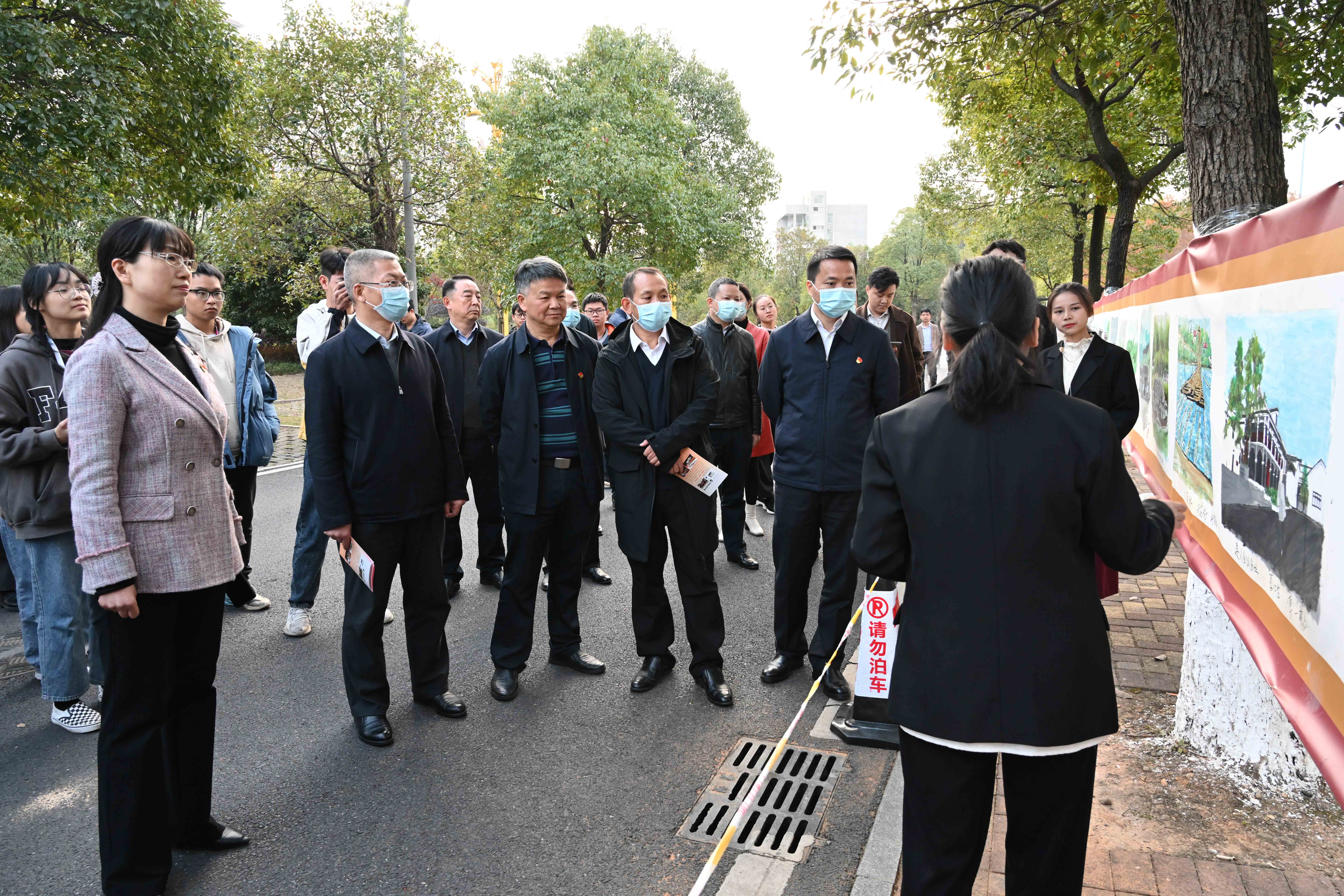 指导组一行首先来到taptap点点建筑与城市规划学院举办的“百栋历史建筑 呈现百年风华”手绘作品展览现场,饶有兴致地听取了学生解说员的介绍,对同学们绘制百座中国红色地标建筑致敬党的百年华诞,真正将专业课程和党史学习有机融合的方式表示高度赞赏。