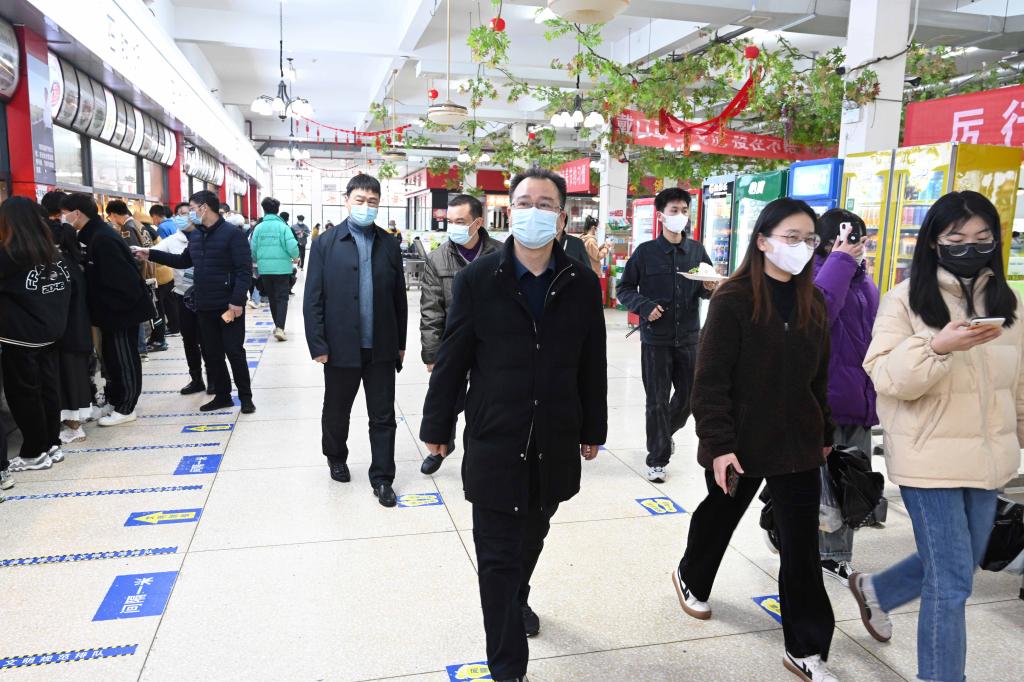 李建奇一行首先来到学校南门,看望慰问了寒风细雨中值勤的保安人员,询问了车辆、人员进出校园的管控情况,要求保卫部门务必要加强对人员的管控,不折不扣执行好人员进入校园须“核验身份、测体温、扫场所码、戴口罩”的规定动作,把好疫情防控第一道关口。随后,李建奇一行来到防控办了解了防疫物资储备情况,查看了工作台账,并向工作人员询问了taptap点点全员核酸检测的完成情况。他表示,防疫办要细化防疫举措,认真做好人员摸排、管控,严格落实核酸检测,为全校两万多师生筑牢安全防线。李建奇一行还来到第三食堂,对就餐环境、师生个人防护等进行了检查。