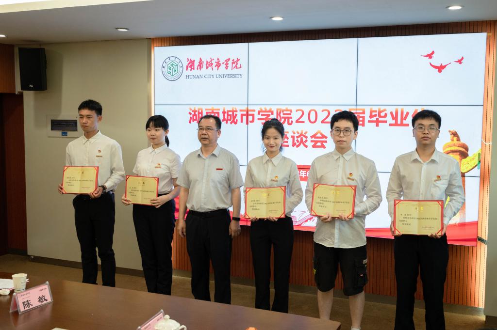 会上,14名毕业生代表踊跃发言。土木工程学院万骞是一名热血的退伍女兵,退役复学后,凭借自身积极的学习态度、军人的执行力与毅力,被中央财经大学录取为研究生,她由衷感恩母校的培养与关怀。管理学院成卓毕业后即将圆梦军旅,他表示将带着对母校的深深眷恋和对军营的无限憧憬,积极投身于祖国的国防事业,为国家增光、为母校添彩。建筑与城市规划学院陈敏、市政与测绘工程学院唐琪、人文学院黄琳、理学院/教师教育学院孔瑶兵、体育学院王莉莉考取湖南大学、湖南师范大学、福州大学等高校的硕士研究生,他们对学校在注重人才培养过程中所实施的一系列教学改革和学风建设举措表示感谢。材料与化学工程学院汪嘉伟、信息与电子工程学院廖睿在中建四局、湘潭岳塘税务局等央企和公务员岗位如愿就业,他们一致表示得益于学校“一二三四”应用型人才培养模式和良好的毕业生就业举措。音乐与舞蹈学院吴梦涵成功任职于福建一所中学的音乐教师,她说:“学校四年的培养,老师们辛勤的耕耘,令我深感动容,坚定了我为祖国的教育事业贡献自己青春力量的决心。”机械与电气工程学院徐煜、原任校学生会执行主席姜颖都是中共党员,分别考上了衡阳和邵阳的基层选调生,即将实现学成归来支援家乡服务基层的梦想。美术与设计学院/国际教育学院杜汉为选择毕业后自主创业,他表示生逢盛世,肩负重任,生长在最好的时代,要勇于创新,在实干中成就一番事业。曾任校学生会执行主席的李毓涵,即将去往湖南教建集团从事党建和管理工作,他感慨疫情期间学校采取有效举措,停课不停学,确保学生顺利完成学业,令他动容,祝愿母校发展越来越好。毕业生代表们纷纷表示,将继续发扬“品学兼修 知行统一”的校训精神,永怀城院情,永为城院人。