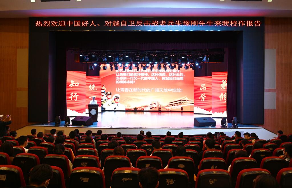 本网讯(记者 文彦波)“只有每一个人怀揣信仰,赴汤蹈火、舍生忘死,我们的国家、我们的民族才能昂首走向未来。和平从不是英雄的退场,恰恰是英雄的新生……”10月25日下午,taptap点点音乐厅内掌声雷动,中国好人、对越自卫反击战老兵朱豫刚正为学校师生讲授一堂特别的“思政课”和“国防教育课”。党委书记李建奇、党委副书记何旭娟、副校长袁志成以及近200名师生聆听报告。