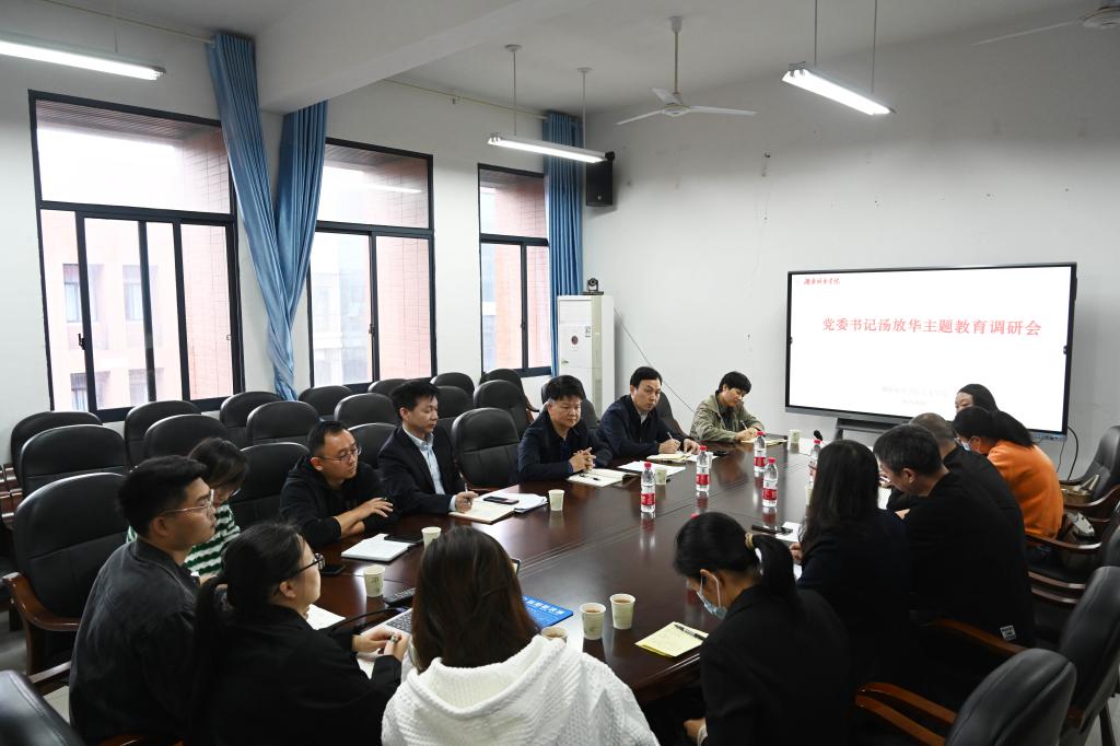 汤放华指出,当前全党上下正在深入开展学习贯彻习近平新时代中国特色社会主义思想主题教育,各二级党组织、党员领导干部要按照学校党委的统一部署,带头把理论学习、调查研究、推动发展、检视整改、建章立制贯通起来,有机融合、一体推进,精心组织实施,系统谋划推进,推动主题教育扎实开展。学院要围绕立德树人这一根本任务开展教学、科研、管理工作,充分发挥思政课育人主渠道作用,着力强化课程思政建设,加强体育教育、美育教育和劳动教育,培养德智体美劳全面发展的社会主义建设者和接班人。