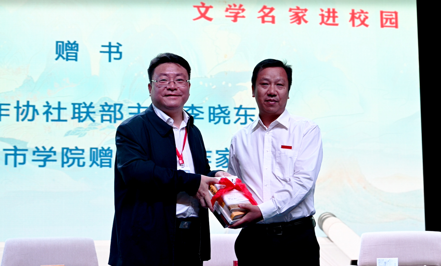 接下来,举行了受邀作家向taptap点点赠书仪式,学校图书馆馆长莫连光代表学校接受了赠书。
