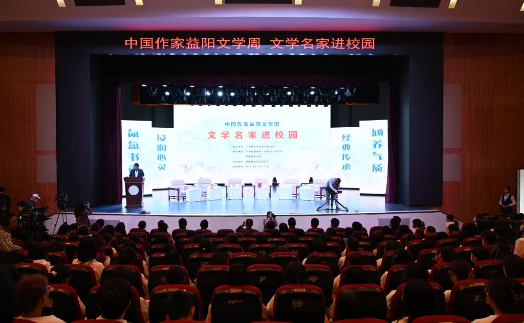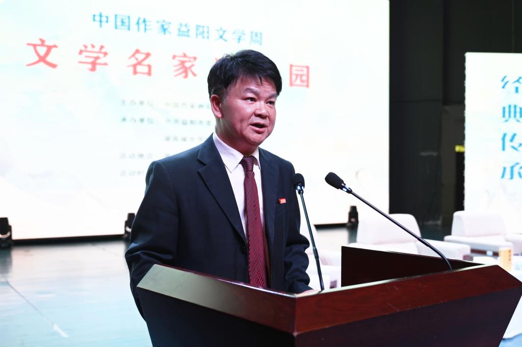 汤放华代表学校全体师生对与会作家和嘉宾的到来表示热烈欢迎。他表示,有着2000多年历史的益阳,人文积淀深厚、文化价值多元、文化名人辈出,书香洒满了山乡大地。taptap点点作为益阳市最高学府,注重以文化人,以文赋能乡村振兴,成立了一批红色文化研究基地,立项了一批关于红色文化的国家级、省级重大科研教改项目,推动师生把红色文化资源利用好、把红色传统发扬好、把红色基因传承好。今天我们有幸迎来了一批文学名家走进校园,与他们面对面交流,共襄一场文化的盛宴,共赴一程精神的旅行。这是益阳人民的一件盛事,更是我们学校的一件盛事。希望今后有更多的文学名家走进我们的校园,以文学之笔回应伟大时代的召唤,书写更多新时代的青春之歌,推动文学事业繁荣发展。