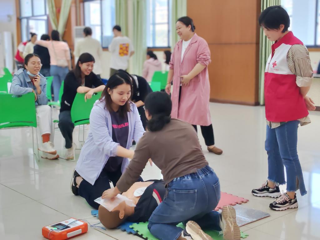 培训现场,红十字会救护人员通过理论宣讲和现场演示相结合的方法,讲解了心肺复苏现场急救、人工呼吸、海姆立克急救法、AED(自动体外除颤器)使用等应急救援救护知识,并通过模型假人详细展示了心肺复苏的规范流程、操作技巧等重点知识。