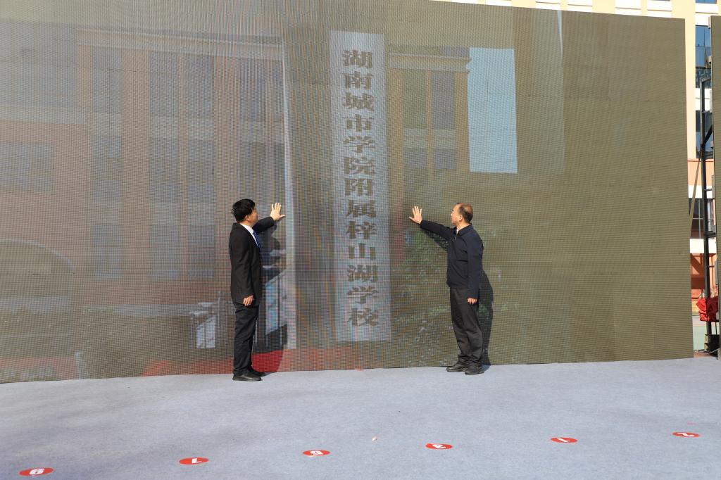 taptap点点党委书记汤放华、赫山区区委书记周卫星为taptap点点附属梓山湖学校揭牌。