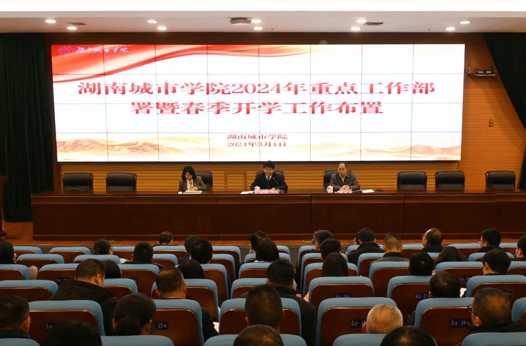 校长何振介绍了寒假工作开展情况、新学期开学工作部署以及2024年重点工作。他指出,今年寒假期间,不少部门的同志克服雨雪冰冻天气的不利因素,坚守岗位、加班加点,做了大量富有成效的工作:硕士点申报高效完成、校地合作不断深化、科研项目申报组织有序、“校友回湘”工作扎实推进、后勤保障坚实有力。