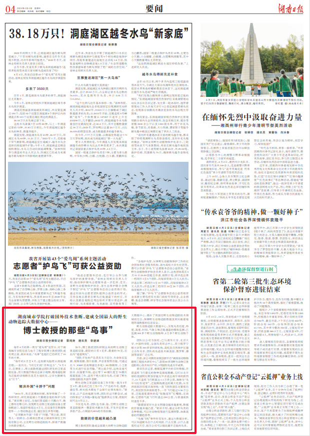 4月4日,《湖南日报》第4版(要闻版)报道taptap点点博士教授团十年来专注于野生动物卫星追踪技术研发。