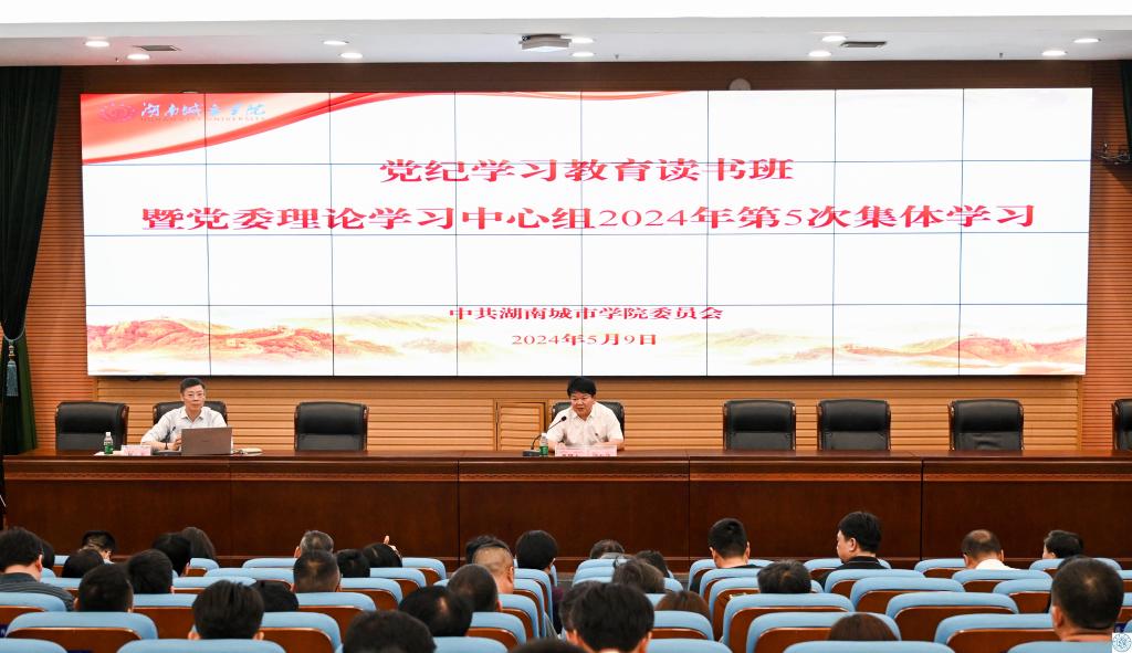 本网讯 (通讯员 钟仁理)5月9日,学校举行党纪学习教育读书班暨党委理论学习中心组2024年第5次集体学习,全体在家校领导出席。党委书记汤放华主持学习,纪委书记陈列尊作主题报告。