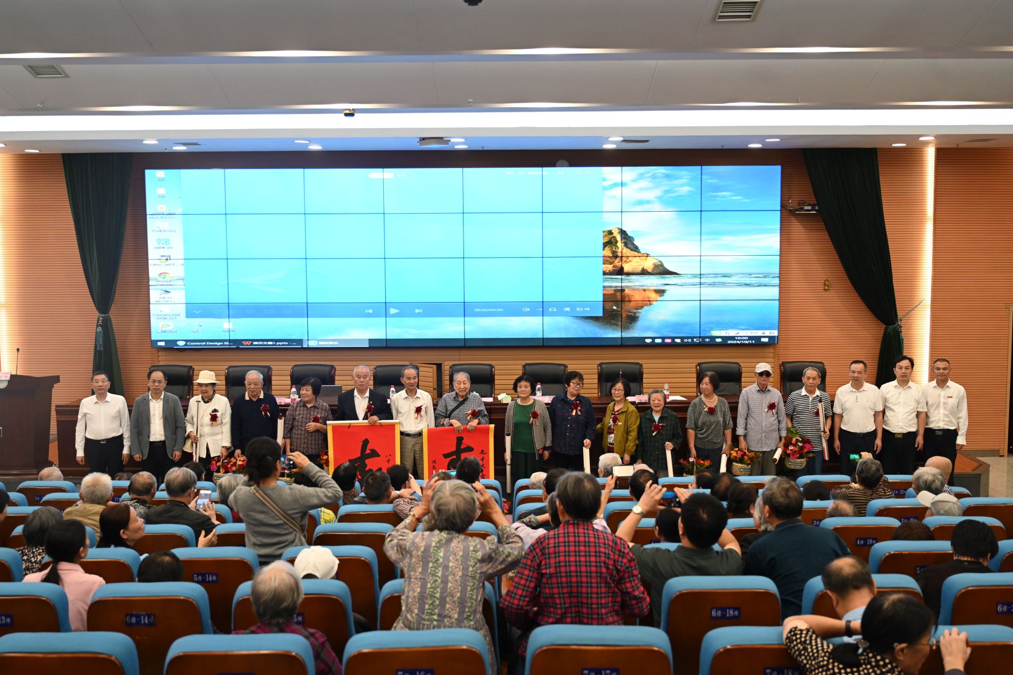 大会宣读了80、90岁整寿星及金婚钻石婚夫妇名单,与会领导分别为各位寿星及金婚钻石婚夫妇献花,祝福寿星们福寿绵延、健康快乐。