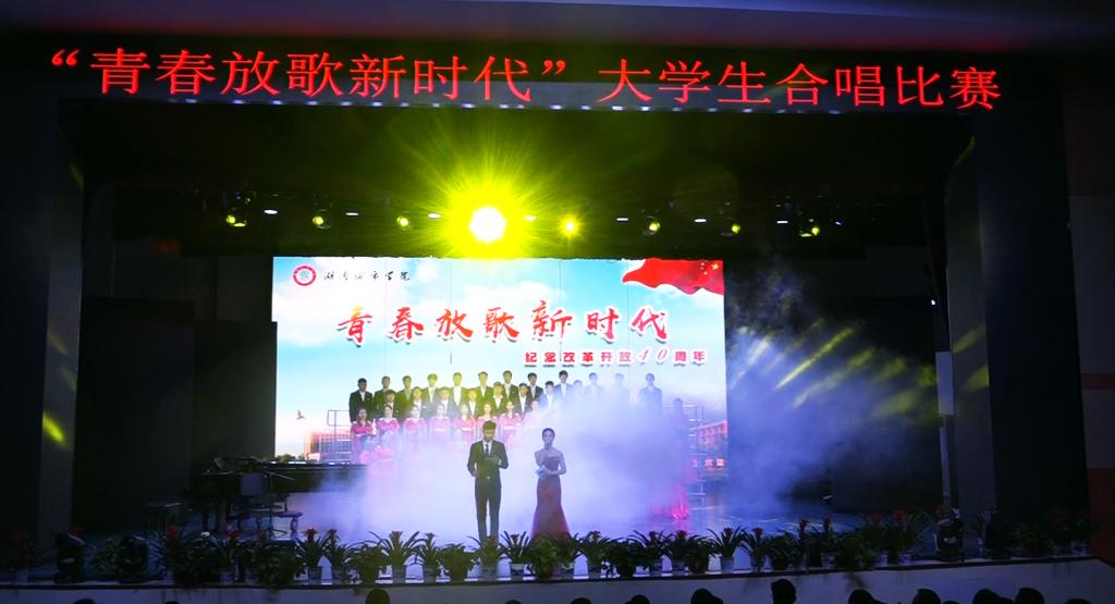 “青青会龙山下,悠悠资水之滨,八百里洞庭潮涌,伴着我们青春的足音......”艺术学院合唱队齐唱校歌拉开比赛序幕,熟悉的旋律瞬间激发了同学们爱校同心的城院情怀。随后,《我爱你,中国》、《把一切献给党》、《唱支山歌给党听》等一曲曲红色经典相继登场,唱出了青年学子对党、对祖国的深厚感情。《春天的故事》、《走进新时代》、《走向复兴》、《光荣与梦想》等一首首脍炙人口歌曲讴歌了祖国迎着新时代的步伐,带领我们在复兴路上从胜利走向胜利的丰功伟绩。参赛队伍引吭高歌,声音嘹亮,极富感染力,现场听众心潮澎湃,歌声、掌声经久不息。