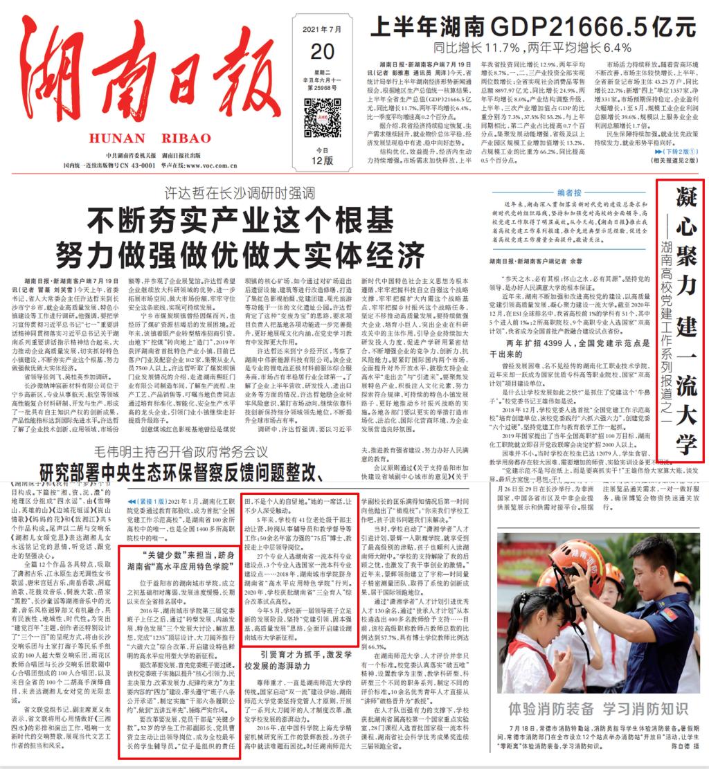 《湖南日报》7月20日头版报道taptap点点以高质量党建引领高质量发展,凝心聚力建设一流大学。
