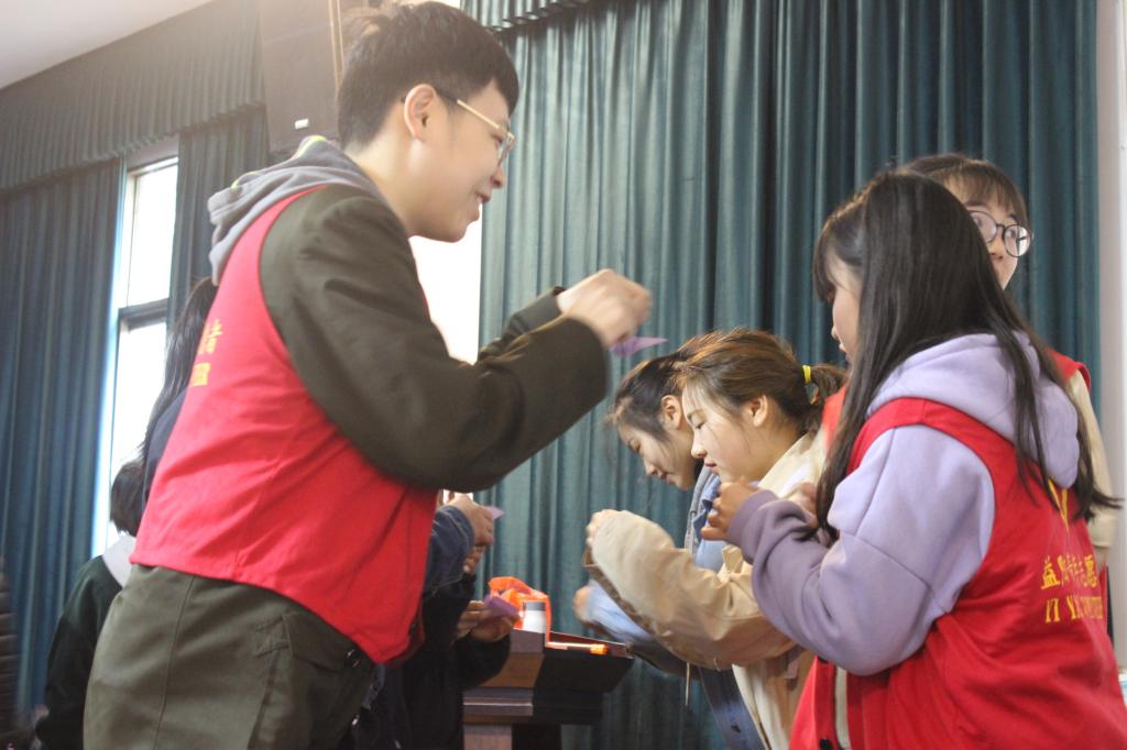 2019年3月17日上午,机械与电气工程学院在益阳市特殊教育学校开展了主题为“关爱阳光下的折翼天使”的特殊学校之行活动,3月17日上午7:50,所有活动人员准时在学校北门集合,发放活动所需物资。上午8时20分,活动车辆从北门出发,前往益阳市特殊教育学校,车辆于8:40分到达指定地点,所有人员下车进校园去看望孩子们。活动伊始,由主持人和学校老师进行开场环节,所有孩子以及活动人员坐下,学校老师以及青志部成员维持现场秩序。随后,活动参与人员依次上台,为孩子们表演节目,节目内容分别有:合唱曲目《隐形的翅膀》、吉他弹唱《成都》、活动策划成员手语表演《感恩的心》,以及李沁璇同学的独舞和易宇同学的花式悠悠球表演。表演中间也夹杂着礼物分发环节,由同学们们为孩子们分发小礼品,孩子们在收到礼物后都十分高兴。最后的环节为所有活动参与人员教孩子们折纸、画画以及带领孩子们玩气球,活动成员们都很认真,以最热情最饱满的态度来对待孩子们。