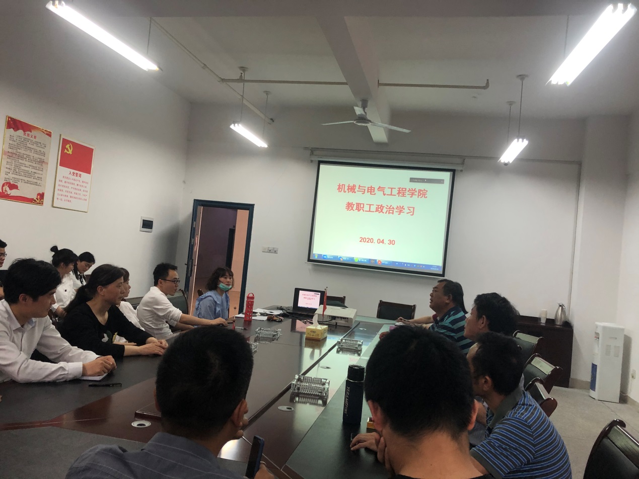进一步贯彻传达taptap点点四届五次教职工、工会会员代表大会成果和精神,2020年4月30日下午,机械与电气工程学院在会议室召开了全院教职工政治学习。由于疫情的影响,本次政治学习采取现场学习与线上会议相结合的形式举行,会议由党总支书记徐畅贤主持。