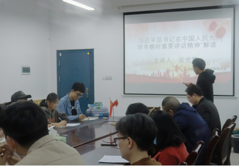 张光富对“习近平总书记在中国人民大学考察时重要讲话精神”进行解读,即学习重要讲话内容、解读讲话意义、结合学院实际落实讲话精神。