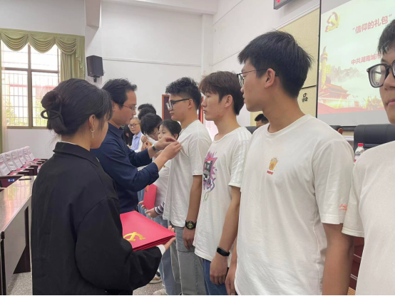 院党委书记张光富、副书记阳同光、易志明为15名师生新党员赠送“信仰的礼包”,佩戴党徽并合影留念。“信仰的礼包”中配有党章、党员手册、《高举中国特色社会主义伟大旗帜为全面建设社会主义现代化国家而团结奋斗》摘编。