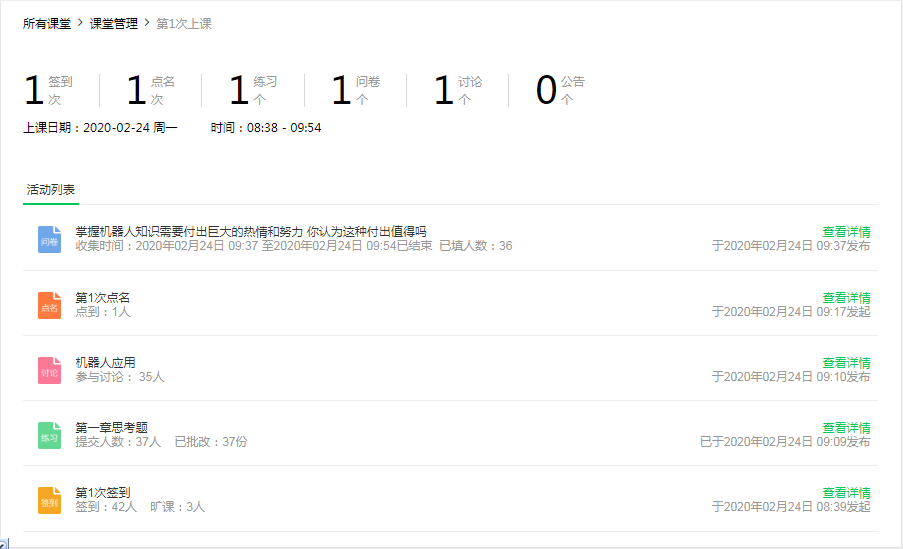 (1)马小林老师的《机器人技术基础》选择了中国大学mooc平台,并在现有资源基础上,补充了部分习题和中间测验的环节,既丰富了内容,又增加了互动性。开课前进行了几次全员联测,检查授课内容,精心准备多套预案。授课过程中,采用两种方式交替进行的模式:平台直播采用小班模式,通过在线填报系统实现随堂问答。这种模式 对直播和慕课是一种有效的互动补充。