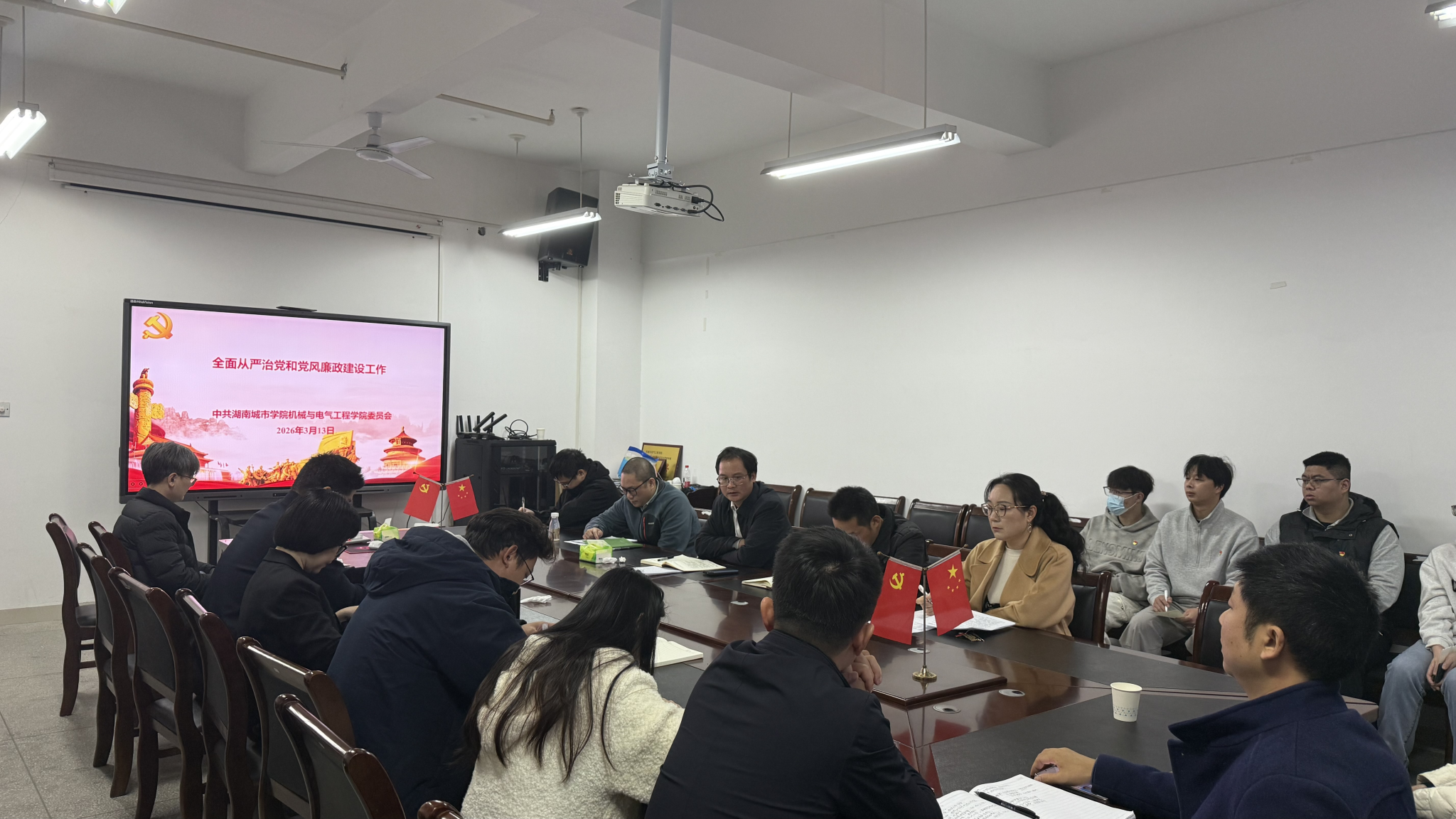 (通讯员:罗紫怡)313日上午,机械与电气工程学院党委召开2026年全面从严治党暨党风廉政建设专题会议。会议深入学习贯彻习近平新时代中国特色社会主义思想,全面落实新时代党的建设总要求和全面从严治党战略部署,进一步压紧压实管党治党政治责任,推动学院党风廉政建设和反腐败工作向纵深发展。学院党委副书记、院长张光富主持会议,学院党委班子成员、各支部委员、系(室)中心主任参加会议。