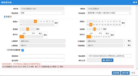 3、在调停课申请窗口,选择调动类别,调课;选择变动信息;根据实际需要,选择调课的原周次、现周次,原星期、现星期,原节次、现节次;代课教师;替换教室;填写调动原因等。点击【提交申请】调课申请提交给管理员审核。