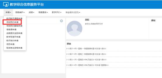 1、用教师身份登录“城院门户”,点击页面左侧“新教务”系统。点击申请→场地预约申请。