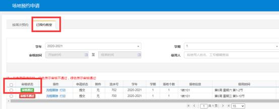 4、教务处审核通过以后,在已预约教室页面将显示审核通过,可将其打印出来作为预约成功的凭证,无须教务处签字、盖章确认。
