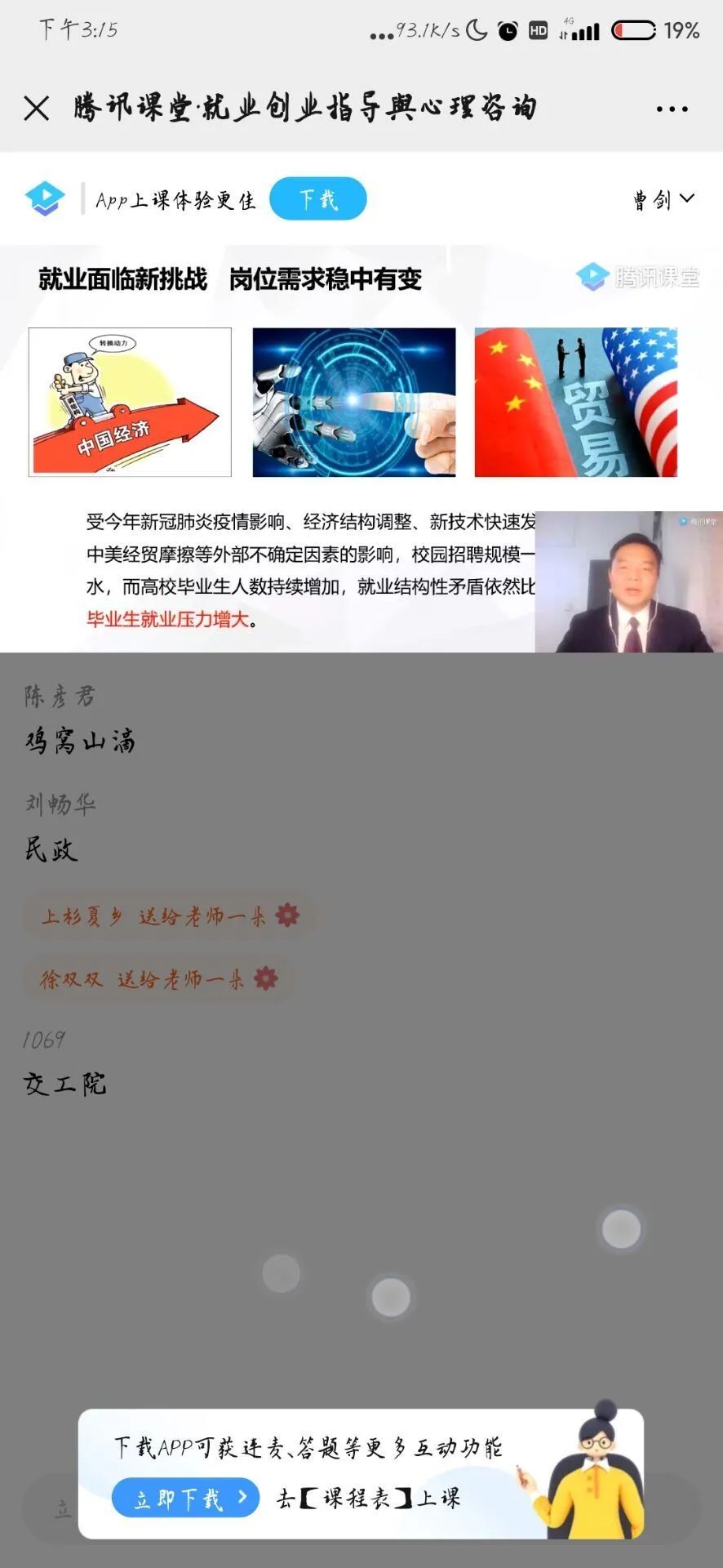 抗击疫情,停课不停学,为了解决毕业生就业创业中遇到的疑问,2020年2月25我院组织毕业生观看省就业指导中心针对学生开展线上就业创业指导及心理咨询系列活动。这次活动我院毕业生积极配合,取得良好的效果,一起来和械械看看我院毕业生的观看状态。