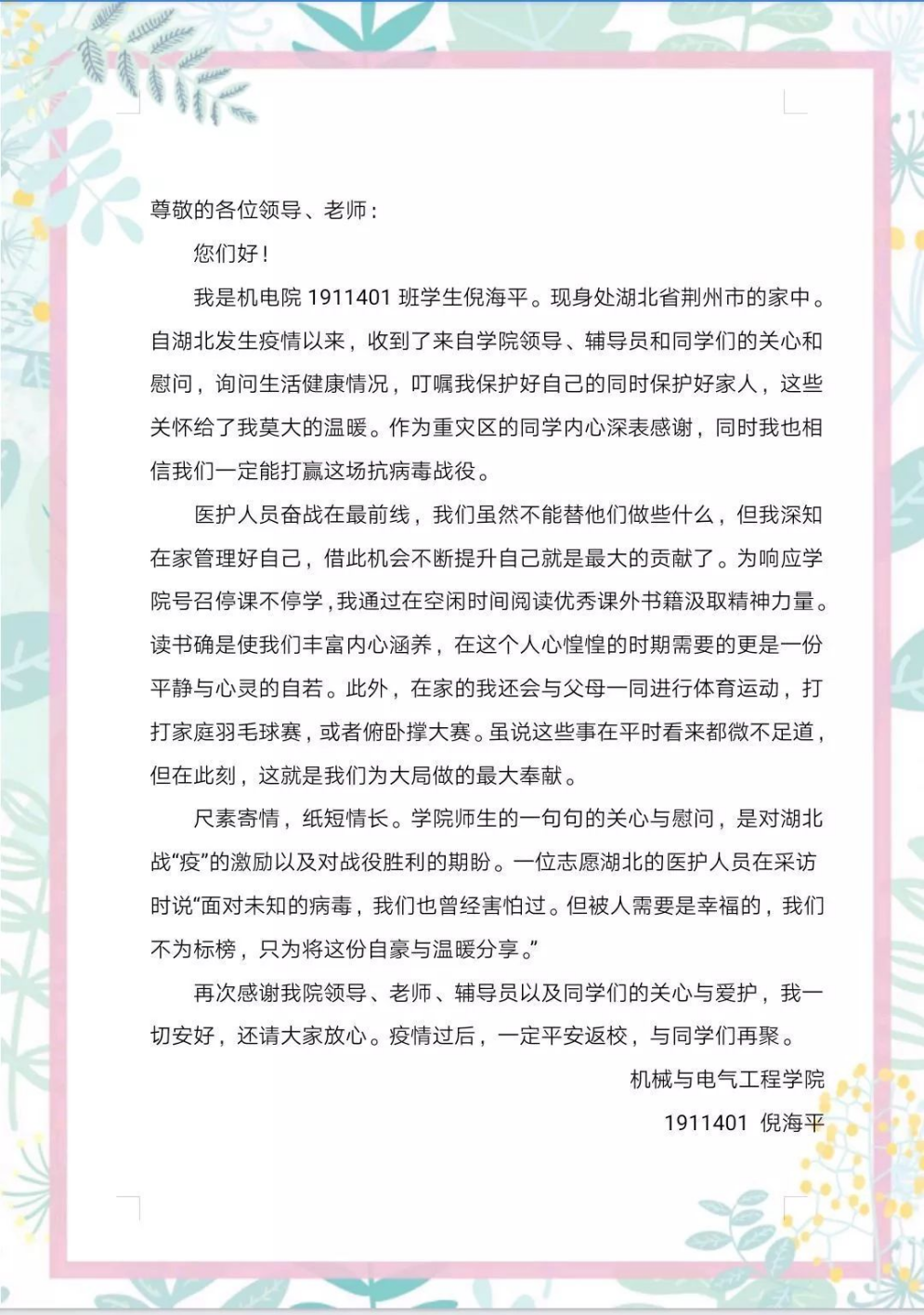 同心协力、英勇奋斗、共克时艰,2月13日,taptap点点机械与电气工程学院党总支书记徐畅贤、院长阳同光与学子紧密联系,并代表学院通过信件向身在抗击疫情前线的湖北籍学生送去学院的关怀和问侯。