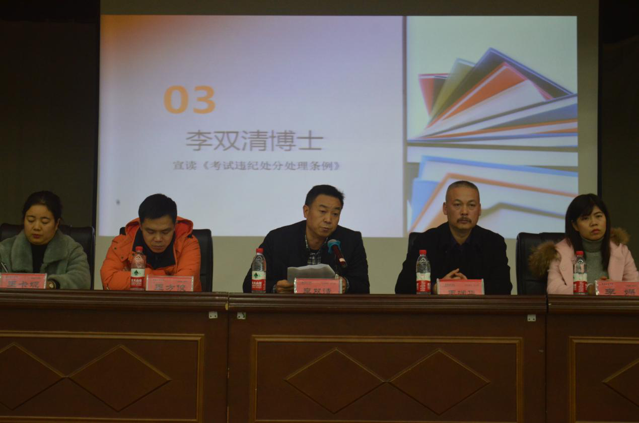 会议由学工办负责学风建设工作的张力老师主持。副院长李双清老师宣读了《taptap点点考试违纪处分处理条例》,解读了考试作弊行为的认定和处理办法。党委副书记王润华老师解读了国家考试入刑处理条例,对公平诚信考试提出了要求;同时,对2019届学生寒假社会实践安排、社会实践报告做了部署;强调了学生寝室用电安全、寒假放假出行交通安全、学生自身财产安全的安全注意事项。