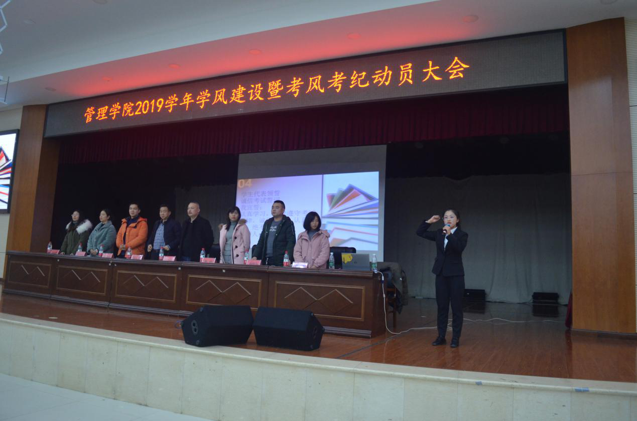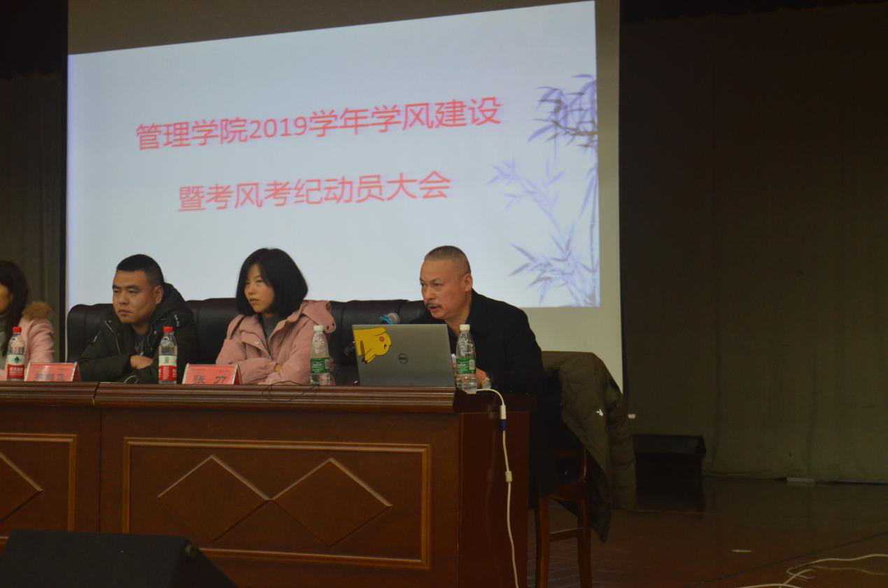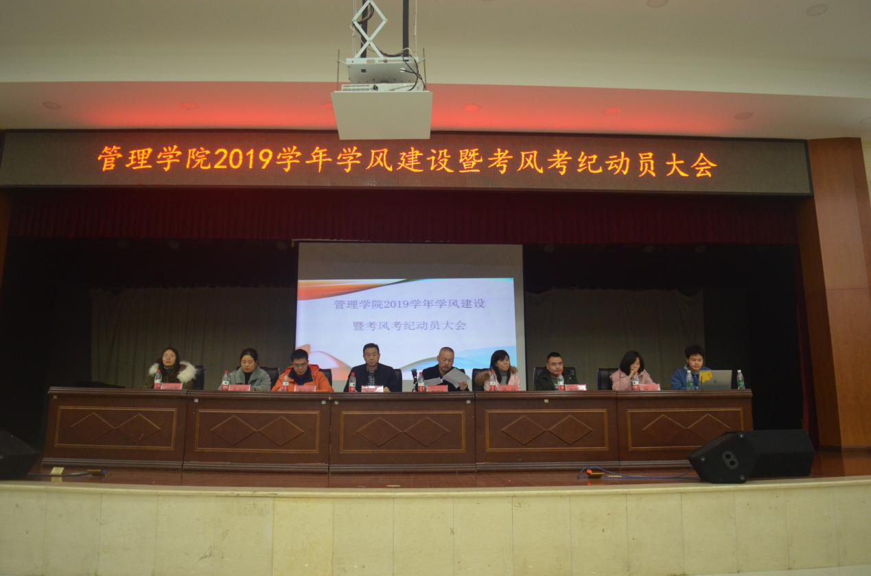2019年12月29日19:30,管理学院2019学年学风建设暨考风考纪动员大会在大学生活动中心举行。学院党委副书记王润华、副院长李双清、全体辅导员老师、2019届全体学生、大二和大三各班学委、预备党员、入党积极分子、团学会主席团部长团成员参加了会议。