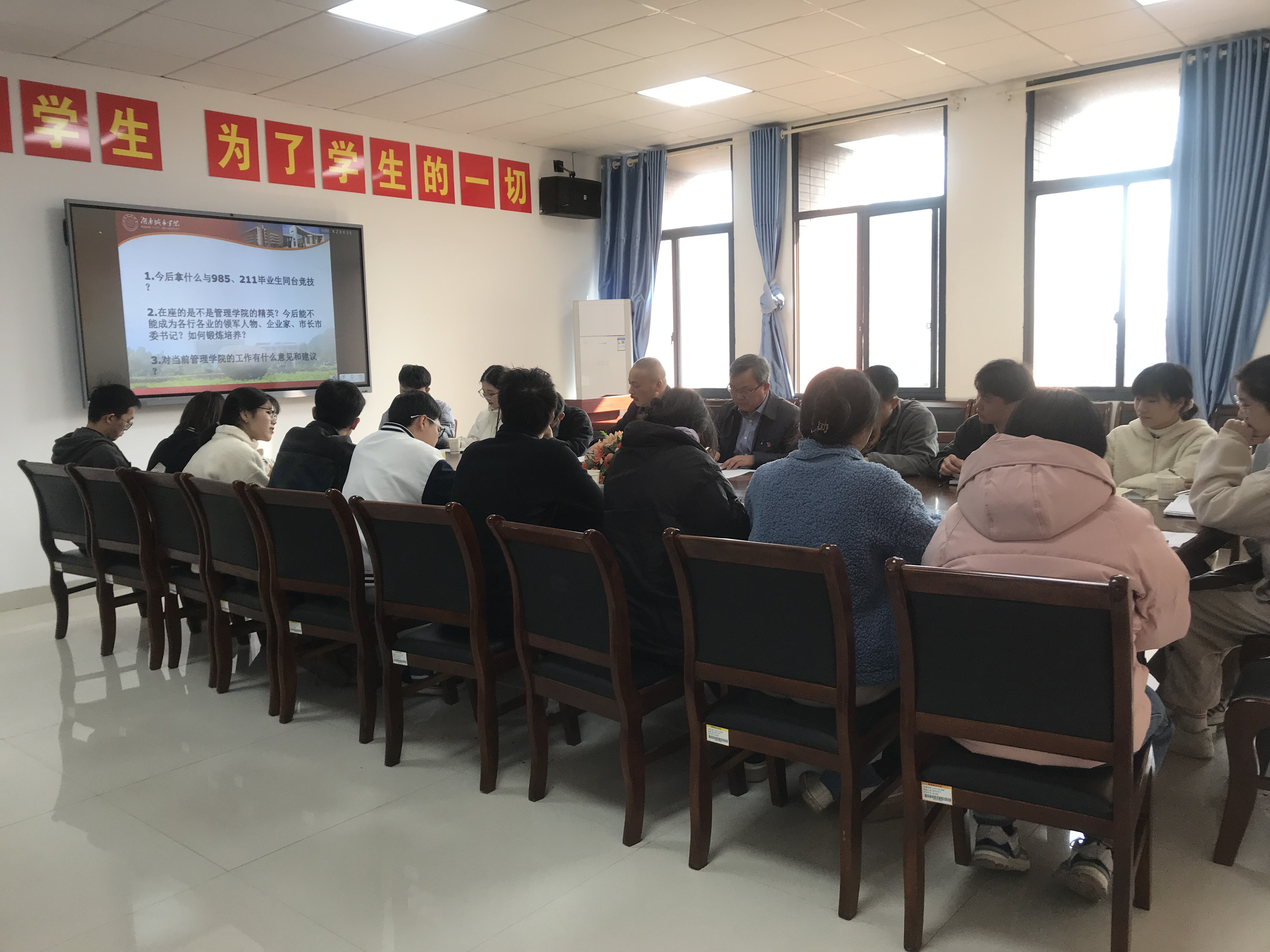 会议第二项,学生干部代表就taptap点点学生与其他985、211高校毕业生之间的差距及对学院管理工作的意见和建议进行了简要发言。学生干部提出,普通大学毕业生与985、211大学毕业生在学业水平、就业机会、职业成长空间、薪资待遇等诸多方面均有差距。因此我们需要有健康的身体、扎实的专业知识、强烈的责任心、良好的协调沟通能力和实干精神、志存高远、胸怀宽阔的格局才能与之同台竞技。
